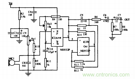 監jian控kong拾shi音yin器qi的de主zhu電dian路lu的de作zuo用yong是shi利li用yong話hua筒tong將jiang聲sheng音yin信xin號hao進jin行xing拾shi取qu,放fang大da到dao一yi定ding的de幅fu度du輸shu出chu,以yi便bian通tong過guo線xian路lu傳chuan輸shu到dao音yin頻pin監jian控kong係xi統tong中zhong進jin一yi步bu放fang大da處chu理li。該gai電dian路lu由you駐zhu極ji體ti話hua筒tongMI CI和偏置元件R2、c3、C9、Rpl 、RI O、R9和c8構成話筒輸入電路,運算放大器IC2A與外圍元件Rp3、R4、C10、R11構成電壓放大電路,IC2B與其外圍元件R12、R13、R14、R5、R6、C5構成電流驅動電路,R6、c6、R7、c 7、R8構成濾波輸出電路。主電路中c4放在電路電源引腳附近可以使交流噪聲短路去耦,進一步降低了電源的紋波。