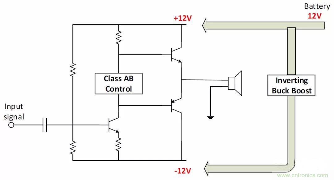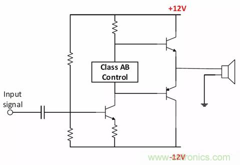 雙電源放大器比較常見,因為它效率更高,能夠在不導致DC損耗的前提下複製輸入波形。圖11A顯示了具有±12V軌的音頻放大器,圖11B顯示了具有±5V軌的運算放大器。