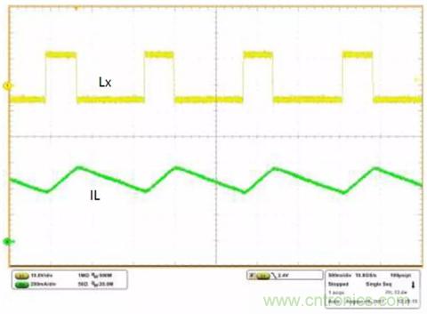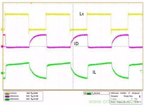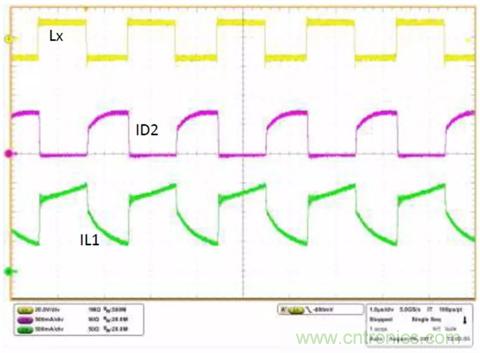 在低壓側開關接通的周期中(圖1中紅色箭頭指示的電流),zhudianliuxiepoxiajiang,bingshifangbianyaqicihuadianganzhongcunchudenengliang,yicicefuzaidianliuyoushuchudianrongqitigong。ercicedeerjiguanzhengxiangpianzhi,dianliucongbianyaqiliuchugonggeifuzai,weierciceshuchudianrongqichongdian。zaiwendingzhuangtaixia,jiadingerjiguanyajiang、變壓器繞組電阻和漏感可忽略不計,二次側輸出電壓與主輸出電壓成反比。圖2顯示了ISL85413 DEMO3Z +/-輸出隔離降壓演示電路板的工作波形。