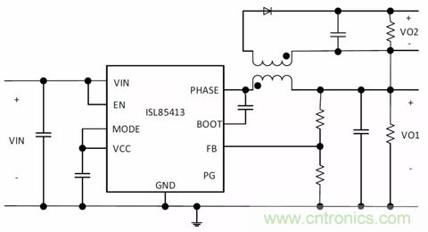 仍reng然ran運yun用yong通tong過guo耦ou合he電dian感gan器qi或huo變bian壓ya器qi生sheng成cheng次ci級ji輸shu出chu這zhe個ge概gai念nian,但dan二er次ci側ce可ke以yi按an不bu同tong方fang式shi配pei置zhi,以yi生sheng成cheng正zheng或huo負fu的de次ci級ji電dian壓ya。為wei了le生sheng成cheng正zheng次ci級ji輸shu出chu,要yao將jiang變bian壓ya器qi/耦合電感器和二次側二極管的極性反過來。圖3顯示了隔離式降壓拓撲生成兩個+VOUT軌。