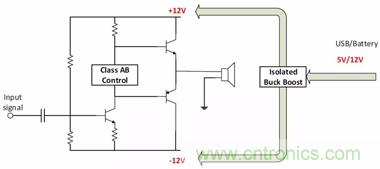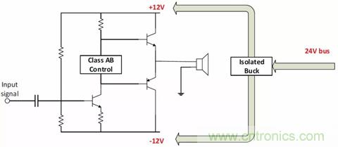 為這類應用選擇合適的拓撲時,需要考慮輸入電壓。例如,為以±12V軌運行的音頻放大器供電,如果輸入電源軌是24V,就選擇隔離式降壓拓撲。如果使用12V電池,就可以用反相降壓-升壓拓撲,以生成負壓軌。如果使用5V USB、12V電池或綠色能源供電的係統,就應該采用隔離式降壓-升壓拓撲。圖12說明了如何用各種拓撲給音頻放大器供電。