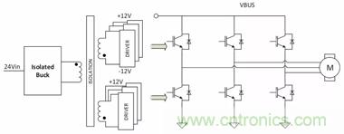隔離式柵極驅動器一般用於大功率逆變器應用,包括UPS係統、電機控製、高密度放電(HID)燈鎮流器和感應加熱。其他應用包括AC和DC變速驅動、工業/太陽能逆變器和伺服驅動。圖13顯示了使用隔離式降壓轉換器的具有IGBT柵極驅動偏置的3相逆變器。