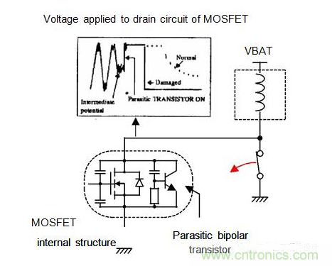 當MOSFET處於關閉狀態時,開關的開啟會導致MOSFET的破壞:由於機械開關的短暫時間,高的dvdt會激活在MOSFET中包含的寄生晶體管。浪湧的能量將集中在這種寄生晶體管上;這可以破壞寄生雙極晶體管,並破壞MOSFET本身。MOSFET在漏極源和源極之間的絕對短路損壞。