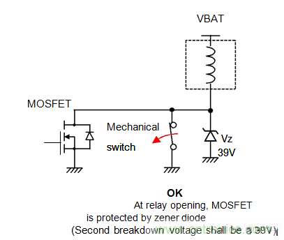 2.使用一個zener保護二極管,其電壓低於MOSFET的第二次擊穿電壓(第二個擊穿電壓可以低到50%的VDSmax)選擇MOSFET(第二次擊穿電壓為39V)。