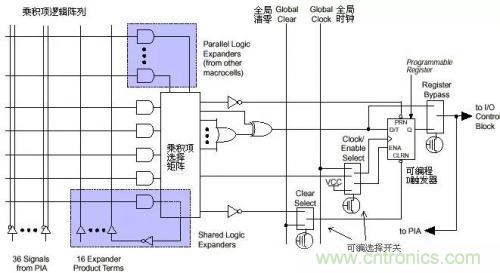 左側是乘積項陣列,實際就是一個與或陣列,每一個交叉點都是一個可編程 熔絲,如果導通就是實現“與”邏輯。後麵的乘積項選擇矩陣是一個“或”陣列。兩者一起完成組合邏輯。圖右側是一個可編程D觸發器,它的時鍾,清零輸入都可 以編程選擇,可以使用專用的全局清零和全局時鍾,也可以使用內部邏輯(乘積項陣列)產生的時鍾和清零。如果不需要觸發器,也可以將此觸發器旁路,信號直接 輸給PIA或輸出到I/O腳。