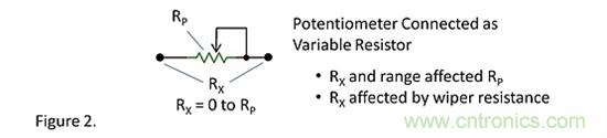 如圖2所suo示shi,當dang電dian位wei器qi充chong當dang可ke變bian電dian阻zu時shi,它ta的de電dian阻zu精jing度du以yi及ji溫wen度du係xi數shu將jiang會hui影ying響xiang到dao電dian路lu。滑hua片pian接jie觸chu電dian阻zu會hui影ying響xiang到dao電dian路lu的de電dian阻zu,並bing且qie滑hua片pian接jie觸chu電dian阻zu阻zu值zhi會hui隨sui著zhe位wei置zhi、溫度、振動以及時間的變動而變動。