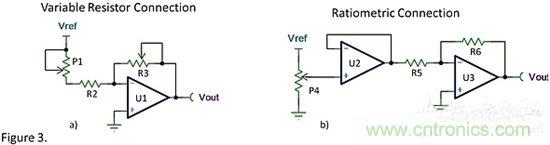 圖3b中引入了運算放大器U2,使得電位器工作在比例模式,從而可以消除圖3a中的缺陷。運算放大器U2提供了高的輸入阻抗從而減小了接觸電阻的影響。隨著電位器位置的變動,運算放大器U2的輸出電壓從0V到Vref之間精確變化。給運算放大器U3提供一個精確的電壓範圍,從而隻需給R5、R6設定一個固定的阻值,而且不需要對電路進行增益調節。