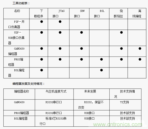 編程器型號有GANG430(RS232串行接口,串口、1拖8,支持JTAG、SBW,不支持BSL),PRGS430-IIIA多功能編程器(支持JTAG、SBW、BSL),這些編程器都可以做離線燒寫,並且支持燒寫熔絲,即脫離計算機來對目標板燒寫,其中PRGS編程器還支持序列號燒寫方式。另還有專門的BSL編程器,隻支持BSL接口,不支持燒寫熔絲。