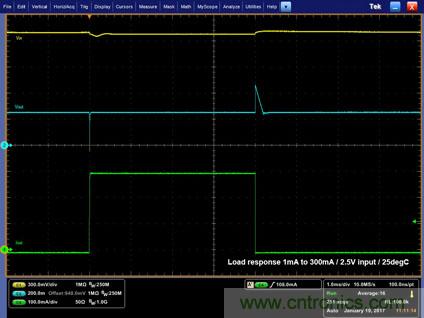 a) 由於有限的控製回路速度,負載電流的快速變化會導致輸出電壓的變化。有時內部調節回路無法對電流的快速變化(由於時間延遲)作出反應,就會導致通常約為幾十毫伏(mV)的下衝/過衝。