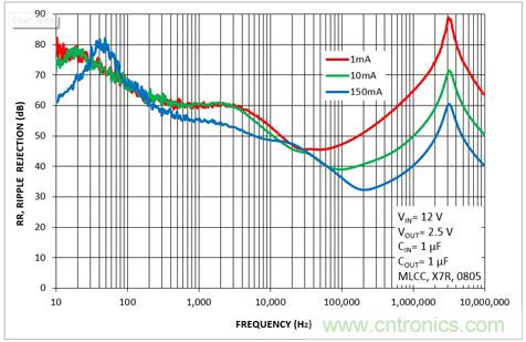 b)輸入電壓的快速變化(通常是由DC-DC轉換器的輸出電壓紋波引起的)無法通過控製回路完全過濾,於是輸入電壓的變化會一定程度地反映在輸出電壓中,該參數稱為電源抑製比(PSRR),且通常是頻變參數。一些製造商標示的PSRR為負數,有些則為正數。一般而言,PSRR絕對值越高,從輸入到輸出的傳輸幹擾信號就越少。通常情況下,受到幹擾的輸入電壓會以mV或更低的單位級別傳輸至輸出端。相似地,輸入電壓的快速變化(即“線路瞬態響應”)可發生於LDO輸出端。