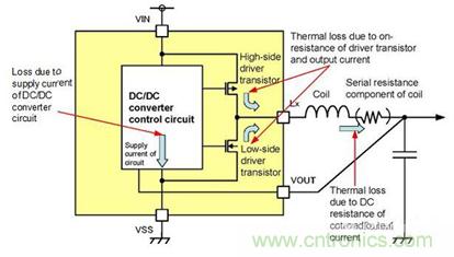 使用DC/DC轉換器所期待的最大目的之一是高效率地轉換能量。提高效率的方法在於降低損耗。如圖3所示,作為發生損耗的問題,可以列舉IC的消耗電流、驅動器晶體管導通電阻產生的熱損耗,線圈的串聯連接而產生的損耗等重大原因。
