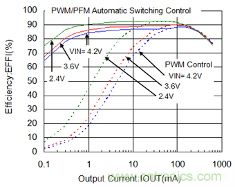 XC9236具有對應負載變化自動地轉換PFM工作和PWM工作的功能。這種功能可同時滿足輕負載時提高效率和重負載時保持低紋波,有利於在整個負載範圍提高效率。(參照圖4)