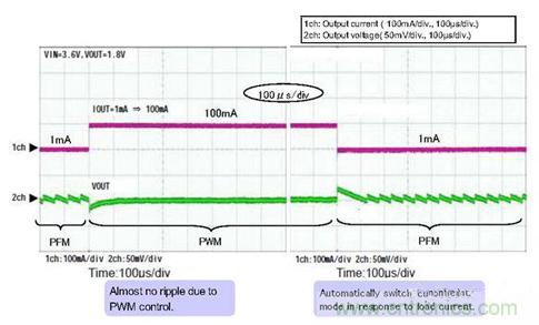 圖3 PFM控製和PWM控製自動轉換波形(負載電流:1mA⇔100mA)