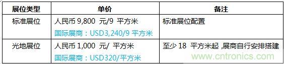 標準展位配置包括:展位租金、展位搭建拆除費用、展位地毯鋪設、中英文楣板字、谘詢桌一張、洽談桌一張、折椅兩把、紙簍一個、射燈兩盞、220V 插座一個、會刊登錄、參展商證件。