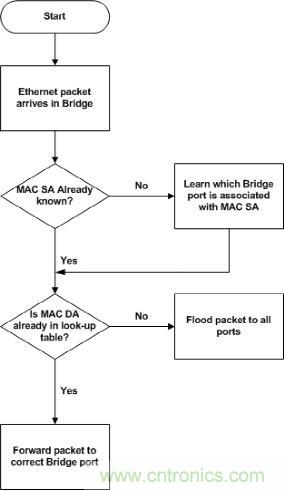 在圖1中,如果傳入幀的源地址(SA)以前沒有記錄,則將其與幀的傳入端口號一起添加到地址數據庫中。如果目標地址(DA)已經存在於網橋的查找表中,則數據包會相應地轉發,否則幀將被泛洪處理。多年來,管理L2所用協議的IEEE標準(如802.1 MAC橋、VLAN和基於端口的網絡訪問控製標準)都集中在以太網幀的前16個字節。這些標準也在不斷發展,最近增加的包括以太網音視頻橋接技術(AVB)和時間敏感網絡標準(如802.1AS)。特別是,在汽車環境中對確定性網絡的需求正變得越來越急迫,以確保網絡中及時和可靠的數據傳輸。將所有ECU鎖定在單個主時鍾源並保持AV內容質量隻是其中兩個例子,更多增強的功能還在引入以便於檢查OSI 3層信息,例如IPv4 / IPv6數據包優先級和IPv4 / IPv6偵聽。