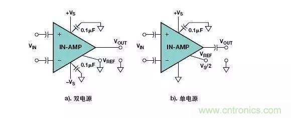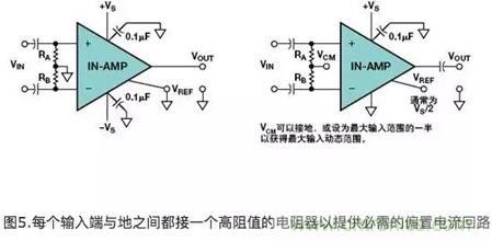 這兩隻電阻器為輸入偏置電流提供了一個放電回路。在圖5所示的雙電源例子中,兩個輸入端的參考端都接地。在圖5b所示的單電源例子中,兩個輸入端的參考端或者接地(VCM接地)或者接一個偏置電壓,通常為最大輸入電壓的一半。