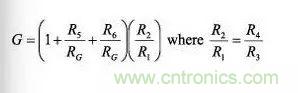 例如,流行的儀表放大器設計配置使用上圖所示的三運放結構。其信號總增益為
