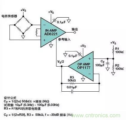 上麵示出的CF試用值能夠提供大約0.03 Hz的–3 dB極點頻率。接在R3兩端的小電容器(0.01 μF)可使電阻器噪聲最小。