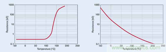 在超出某一特定溫度時,正溫度係數 (PTC) 熱敏電阻(左圖)的電阻出現急劇升高,故而適合用作溫度限值傳感器。而負溫度係數 (NTC) 熱敏電阻的電阻則呈線性關係,故而適用於溫度測量。