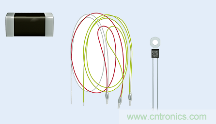 從左至右:安裝在印刷電路板上的SMT正溫度係數 (PTC) 傳感器、與電機繞組進行集成的正溫度係數 (PTC) 傳感器、安裝在散熱片上帶接線端子的正溫度係數 (PTC) 傳感器。