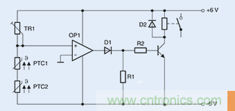 切換原理:記錄溫度限值圖3顯示為由兩個串聯正溫度係數 (PTC) 傳感器組成的一個簡單電路,。TR1與兩個正溫度係數 (PTC) 傳感器組成一個分壓器,該分壓器能夠提供運算放大器的非反相輸入,而運算放大器則充當比較器的角色。
