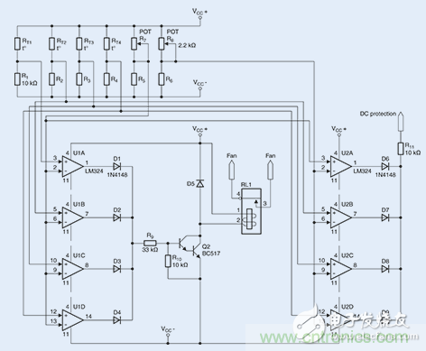 2個開關閾值的參考值將通過2個微調器,即R7和R8(分別為2.2 kΩ)進行設置。如上所述,兩個微調器將分別產生900Ω或550Ω的電阻。至於8個所需的比較器(U1A-U1D以及U2A-U2D),則采用經濟型LM324放大器。在滿負荷跳線模式下進行的一個持續數小時的測試表明,風扇能夠在85℃時可靠地進行開啟。由於係統具有相對較低的熱量期限,故而無需采用常用的滯回比較器電路。