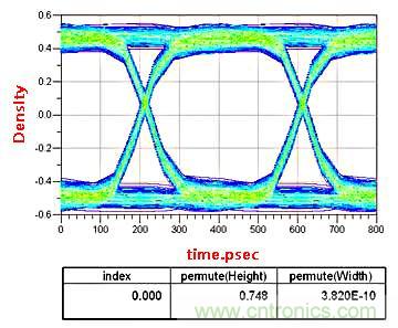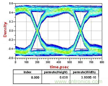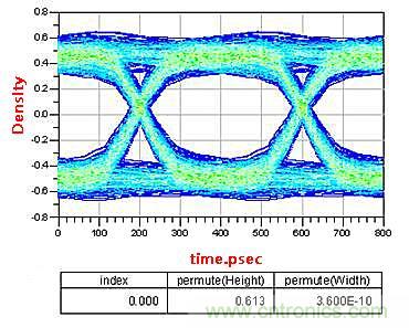 在(zai)低(di)速(su)電(dian)路(lu)設(she)計(ji)中(zhong),這(zhe)顆(ke)電(dian)容(rong)可(ke)以(yi)等(deng)效(xiao)成(cheng)理(li)想(xiang)電(dian)容(rong)。而(er)在(zai)高(gao)頻(pin)電(dian)路(lu)中(zhong),由(you)於(yu)寄(ji)生(sheng)電(dian)感(gan)的(de)存(cun)在(zai)以(yi)及(ji)板(ban)材(cai)造(zao)成(cheng)的(de)阻(zu)抗(kang)不(bu)連(lian)續(xu)性(xing),實(shi)際(ji)上(shang)這(zhe)顆(ke)電(dian)容(rong)不(bu)能(neng)看(kan)作(zuo)是(shi)理(li)想(xiang)電(dian)容(rong)。這(zhe)裏(li)信(xin)號(hao)頻(pin)率(lv)2.5G,通道長度4000mil,AC耦合電容的位置分別在距離發送端和接收端200mil的位置。我們看一下仿真出的眼圖的變化。