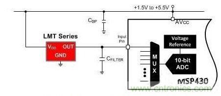 模擬溫度傳感器是一個有源半導體器件,它的輸出是與溫度成比例的電壓值或電流值。作為一個集成電路 (IC),模擬溫度傳感器具有熱敏電阻所不具備的內置智能性,從而使與模擬溫度傳感器有關的設計工作變得簡單。圖3顯示了其中一款TI LMT係列模擬溫度傳感器的典型應用,在這個應用中,隻有IC,而未使用外部組件。