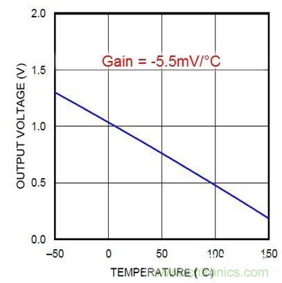 圖4:LMT84輸出電壓與溫度之間的關係圖