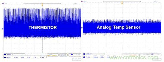 圖6顯xian示shi的de是shi,被bei安an裝zhuang在zai開kai關guan穩wen壓ya器qi上shang的de一yi個ge模mo擬ni溫wen度du傳chuan感gan器qi與yu一yi個ge熱re敏min電dian阻zu在zai嘈cao雜za環huan境jing中zhong的de工gong作zuo噪zao聲sheng的de比bi較jiao圖tu。在zai室shi溫wen下xia,熱re敏min電dian阻zu與yu傳chuan感gan器qi的de噪zao聲sheng水shui平ping相xiang等deng,不bu過guo在zai溫wen度du比bi較jiao高gao的de環huan境jing中zhong,由you於yu熱re敏min電dian阻zu的de分fen辨bian率lv下xia降jiang,它ta的de噪zao聲sheng水shui平ping會hui變bian得de更geng差cha。通tong常chang情qing況kuang下xia,模mo擬ni溫wen度du傳chuan感gan器qi的de工gong作zuo噪zao聲sheng比bi熱re敏min電dian阻zu的de噪zao聲sheng水shui平ping低di3倍。