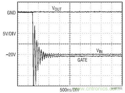 圖 3 示出了當 VIN 帶電插入至 –20V 時出現的狀況。 在連接的前一刻, VIN 、VOUT 和 GATE 以地電位為起始點。由於 VIN 和 GATE 連接線的寄生電感之原 因, VIN 和 GATE 引腳上的電壓將顯著地變至 –20V以下。外部 MOSFET 必須具有一個可安全承受該過衝的擊穿電壓指標。