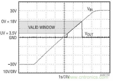 圖 2 示出了圖 1 電路中的 VIN 從 –30V 緩慢斜坡上升 至 30V 時做出的反應。UV 和 OV 門限被分別設定為 3.5V 和 18V。當電源電壓位於 3.5V 至 18V 窗口之內 時, VOUT 跟隨 VIN 。若超出該窗口時,LTC4365 將 關斷 N 溝道 MOSFET,並使 VOUT 與 VIN 斷接,即使 在 VIN 為負值的情況下也不例外。
