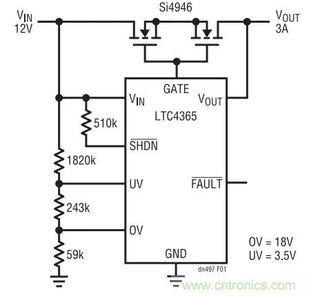 圖 1 示出了一款完整的應用電路。一個阻性分壓器負責設定用於負載與 VIN 連接 / 斷接的過壓(OV)和欠壓 (UV) 跳變點。如果輸入電源漂移至該電壓窗口之外,則 LTC4365 將迅速把負載與電源斷接。