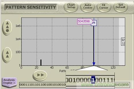 在客戶進行誤碼測試的時候,由於鏈路的損耗和芯片的輸出特性,導致出現了誤碼,但客戶卻想知道究竟是哪一個bit位出現了誤碼,以定位誤碼出現的根源。設置Bert的輸出/輸入端設置為PRBS7的碼型,在誤碼分析功能裏麵選擇Patten Sensitivity,則可以直接觀察PRBS7的127個(ge)比(bi)特(te)的(de)每(mei)一(yi)位(wei)所(suo)出(chu)現(xian)誤(wu)碼(ma)的(de)個(ge)數(shu),看(kan)最(zui)多(duo)誤(wu)碼(ma)所(suo)對(dui)應(ying)的(de)比(bi)特(te)位(wei)的(de)前(qian)後(hou)特(te)性(xing),如(ru)下(xia)圖(tu)十(shi)三(san),移(yi)動(dong)光(guang)標(biao)到(dao)任(ren)意(yi)一(yi)個(ge)比(bi)特(te)上(shang)麵(mian),可(ke)以(yi)看(kan)到(dao)連(lian)續(xu)多(duo)個(ge)0而中間有一個1跳變的bit即127比特的第94比特出現誤碼的個數最多,達到5043598個誤碼。從而判斷由於鏈路ISI的影響導致突然的跳變位出現較高的誤碼率。