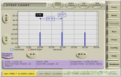 由於客戶的係統要進行長時間的(-20到+80度下)degaodiwenlaohuaceshi,kehuyaokanwumadexingnenghewendubianhuadexiangguanxing,yibandewumayizhinengtongjiwendubianhuaguochengzhongwumadezongdegeshuhewumalv,erwufadezhizaizhenggeshijigexiaoshilimianrenyishikewumalvdebianhua。erBSX係列誤碼儀則可以使用Strip chart的記錄功能將整個過程中記錄下來,後麵可以根據需要查詢任意時刻的誤碼率變化情況。如下圖,在第10/20/30秒(miao)的(de)時(shi)間(jian)點(dian)出(chu)現(xian)了(le)一(yi)些(xie)突(tu)發(fa)的(de)誤(wu)碼(ma),這(zhe)個(ge)如(ru)果(guo)僅(jin)僅(jin)是(shi)通(tong)過(guo)簡(jian)單(dan)的(de)誤(wu)碼(ma)統(tong)計(ji)是(shi)無(wu)法(fa)看(kan)到(dao)時(shi)間(jian)相(xiang)關(guan)的(de)細(xi)節(jie)的(de),而(er)且(qie)其(qi)累(lei)積(ji)記(ji)錄(lu)時(shi)間(jian)可(ke)以(yi)長(chang)達(da)幾(ji)十(shi)小(xiao)時(shi)甚(shen)至(zhi)幾(ji)天(tian)。