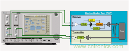 如圖3,除了loopback training以外,另一個重要的步驟是link training(鏈路協商),需要Bert和DUT進行FFE/DFE的實時協商來補償鏈路的損耗,以達到最低的誤碼率。在USB3.1/PCIe協議中發送端會有多個級別的FFE來靈活對信號發送端進行均衡補償,在接收端也會有CTLE和DFE多級組合來進行補償。(詳細的鏈路協商步驟細節可以參考泰克的相關應用文章-《克服第4代I/O應用中的接收機測試挑戰》)。這個鏈路協商同樣需要Bert能夠在一定程度上去模擬一個真實設備和被測設備進行溝通,解析並響應被測設備的要求去調節信號輸出的FFE參數,並根據誤碼率來請求被測設備調節其輸出的FFE參數和接收端的CTLE/DFE參數,以達到最佳的誤碼率。同樣這個時候也需要BERT具備單通道直接輸出和接收並解析基於協議的碼型序列達到與被測設備的實時協商。