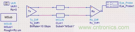 前(qian)麵(mian)說(shuo)到(dao),銅(tong)箔(bo)的(de)粗(cu)糙(cao)度(du)會(hui)影(ying)響(xiang)到(dao)信(xin)號(hao)完(wan)整(zheng)性(xing),那(na)麼(me)我(wo)們(men)就(jiu)來(lai)做(zuo)一(yi)個(ge)實(shi)驗(yan)看(kan)看(kan)。原(yuan)理(li)圖(tu)如(ru)下(xia)所(suo)示(shi),把(ba)銅(tong)箔(bo)粗(cu)糙(cao)度(du)的(de)設(she)置(zhi)為(wei)一(yi)個(ge)變(bian)量(liang),初(chu)始(shi)值(zhi)為(wei)0,仿真的速率為10Gbps: