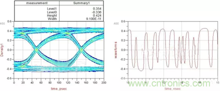 從結果可以看到:眼圖的寬度為97ps,高度為0.652V,信號的峰值為0.479V。