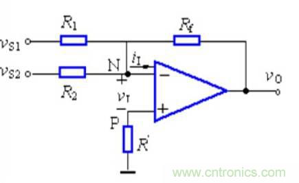 如下圖1-2,是運放實現的加法器,用虛短和虛斷的方法來分析此電路。