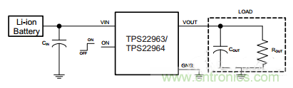 TI負載開關是用來接通和關閉電源軌的集成電子中繼器。大多數基本負載開關采用小型集成封裝,由四個引腳組成:輸入電壓、輸出電壓、使能、和接地,並且包含多重特性,其中有反向電流保護。圖4顯示了一個用來阻斷反向電流的負載開關。