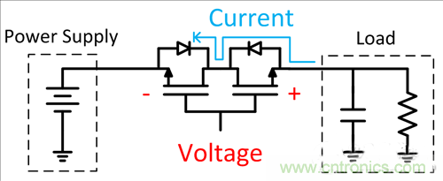 為了在FET關閉時阻斷兩個方向上的電流,你還可以將FET背靠背連接。與二極管解決方案相比,電源到負載的壓降更低,不過這種實現方式占用了大量的電路板麵積。圖3顯示了用來阻斷反向電流的背靠背FET示例。