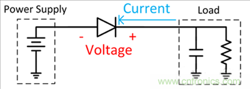 基於這些原因,肖特基二極管是常見的替代器件;它們的正向壓降更低。不過,它們也更加昂貴,且具有更高的反向電流泄露,而這會導致係統問題。圖2顯示的是係統中的一個用來阻斷反向電流的二極管。