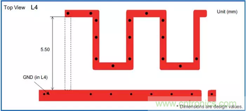曲流型天線的長度比較難確定。長度一般比四分之一波長稍長,其長度由其幾何拓撲空間及敷地區決定。曲流型天線一般是PCB封裝,即板載天線。和倒F型一樣,天線一般放置在PCB頂層,鋪地一般放在頂層並位於天線附近,但天線周圍務必不能放置地,周圍應是淨空區。如圖2,圖3: