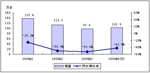 MP3市場各季度銷量同比去年均呈現較大幅度的下滑。2008年第一季度,MP3播放機銷量比去年同期增長-25.3%,第二季度銷量同比增長-50.3%,第三季度銷量比去年同期增長了-53.4%。