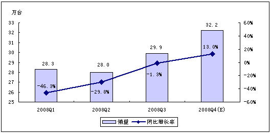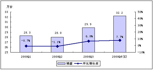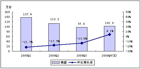 賽迪顧問預測,受全球經濟危機以及中國經濟發展趨緩等因素影響,2008年第四季度,MP3/PMP播放機行業將不會呈現快速增長的勢頭,但年終禮品市場的啟動,在一定程度上仍然會拉動整體市場向前發展。賽迪顧問預計,2008年第四季度,中國MP3/PMP播放機市場銷量為134.0萬台,銷售額將達7.9億元。