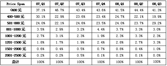 2007年Q1-2008年Q3中國MP3市場不同價格段銷量結構