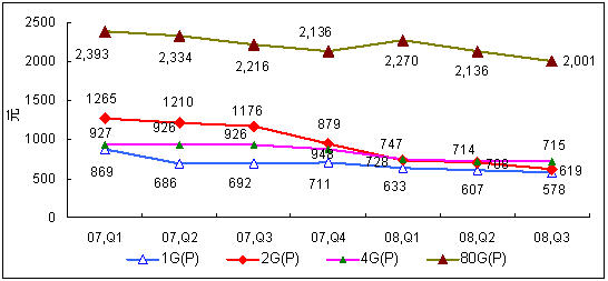 2007年Q1-2008年Q3中國PMP播放機市場不同存儲介質產品價格走勢