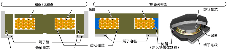 NR 係列產品是指采用了混入鐵氧體粉末樹脂的成型技術,隻使用了鼓型磁芯形成的無袖構造電感產品。(圖3),youyucaiyonglezheyangdegouzao,guzhuangcixinyuxiuzhuangcixinzhijiandekongqifabuhuizaichansheng,woxuandianliudedaoleyizhi,congershijiaoliudikangbeikongzhizaileyigejiaoxiaodefanweinei。tongshiyouyushishiyongshuzhilaigudingzhegejiegou,xiaoxingshebeisuoxudejiaoqiangkangchongjixingyededaolehendadeqianghua。lingwai,tongguocaiyongchaobosheji,shixianlechanpinchicunweijiaoxing3mm(3mm×3mm)、高度1.0mm、1.2mm、1.5mm;角形4mm(4mm×4mm),高度為1.8mm、1.2mm、1.0mm(數值均為Max 值)的產品構成。