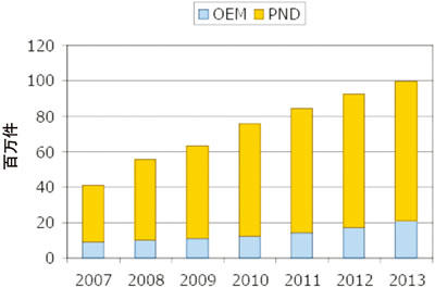 汽車導航市場中,根據ST公司的估計,2008年PND的出貨量同比將增長43%,從2007年的3200萬件增長到4600萬件。主要增長動力依然來自車載導航市場的低於水準的普及率,對市場的教育和推廣的力度依然不夠。低成本的OEM導航儀(兩用便攜導航儀)將會在中級汽車中開辟新的市場,預計到2012年在歐美新售的汽車中,車載導航儀占有率將超過25%。2007-2013年OEM儀表板內置導航儀的年均增長率將達到15%,便攜式導航儀的增長速度為16%,預計到2013年導航市場規模將達到汽車影響的水平。