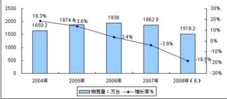 根據賽迪顧問統計數據顯示,2008年1-10月中國DVD播放機市場共銷售DVD播放機1109.2萬台,實現銷售收入55.3億元。下半年,DVD市場略有回暖,預計2008年銷售額將達1519.2萬台,同比下降18.5%,而銷售收入達76.6億元,同比下降20.8%。2004-2008年中國DVD播放機市場銷售量複合增長率為1.17%,銷售額複合增長率為-5.1%。